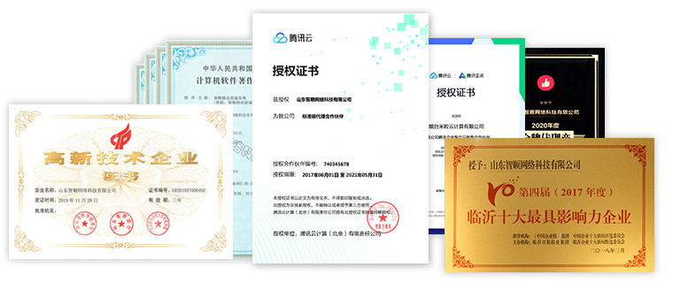高新技术企业;临沂十大最具影响力企业;行业品牌十佳 腾讯云|腾讯企点 授权证书;2020年度有赞微商城代理商/服务商等6余项 软件著作权20余项