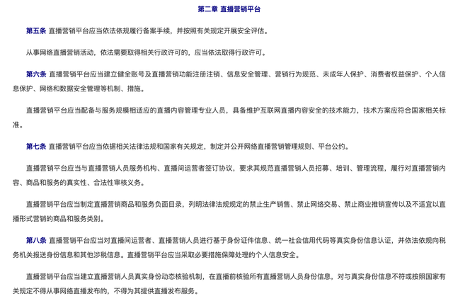 例如,针对直播平台,《办法》明确直播营销平台应当建立健全账号及直播营销功能注册注销、信息安全管理、营销行为规范、未成年人保护、消费者权益保护、个人信息保护、网络和数据安全管理等机制、措施。