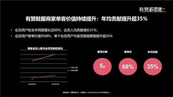 在会员方面,有赞鞋服商家的会员用户数量同比增长超过60%,其中会员用户贡献的整体销售,同比增长31%,而在复购方面会员用户的年均复购次数达到5次,客单价同比增长68%,单个会员年贡献的销售额同比增长超过35%。