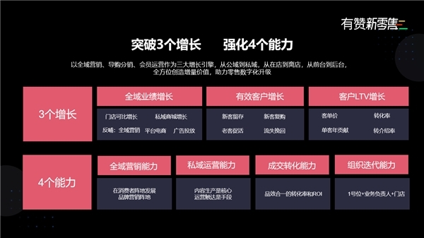 有赞CMO关予表示:“基于过去的数据我们发现,在企业新零售转型的过程中,传统的线下门店、代理商和导购员渠道等体系依然发挥着重要作用,要保持可持续增长,就需要通过数字化建设,全面发挥门店、导购等传统触点的作用。”